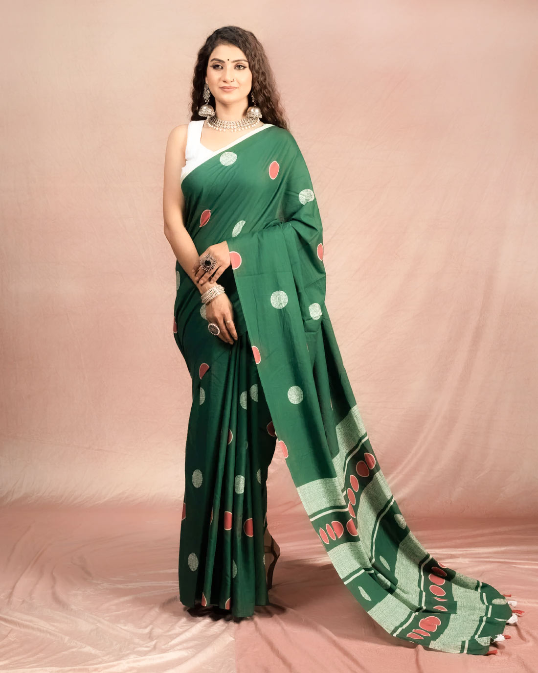 ભીડમાંથી અલગ દેખાવા અને તમારા દેખાવને આકર્ષક બનાવવા માટે, તમે આ સુંદર લીલી અને લાલ પોલ્કા ડોટ સાડી અજમાવી શકો છો. તમને આ પ્રકારની સાડી ઓનલાઈન અને ઓફલાઈન બંને રીતે સરળતાથી મળી જશે. તમે તેને કોન્ટ્રાસ્ટ બ્લાઉઝ સાથે પણ પહેરી શકો છો.