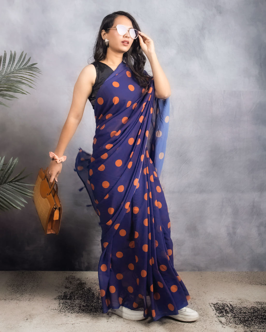 બ્લુ અને ઓરેન્જ પોલ્કા ડોટ સાડી