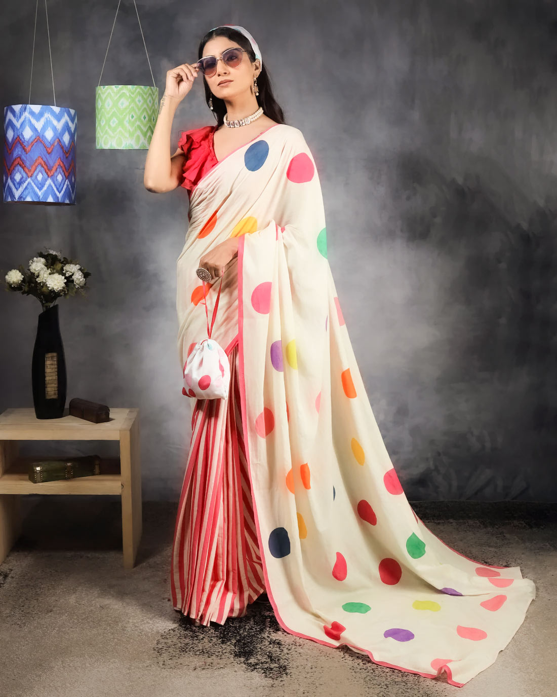 મલ્ટી કલર ઓફ વ્હાઇટ પોલ્કા ડોટ સાડી