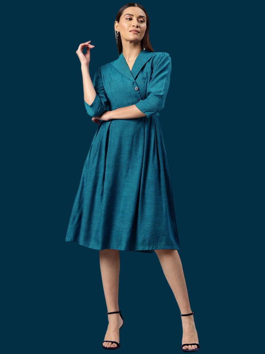 તમે ઓફિસમાં પહેરવા માટે આ સુંદર વેસ્ટર્ન સોલિડ ડેનિમ ફોર્મલ શીથ મિડી ડ્રેસ પણ અજમાવી શકો છો. આ પહેરીને તમે તમારા દેખાવને ખૂબસૂરત બનાવી શકો છો. તમે આ પોશાક ઓનલાઈન અને ઓફલાઈન બંને રીતે ખરીદી શકો છો. આની મદદથી તમે મેકઅપ અને હેરસ્ટાઇલ કરીને તમારા લુકને પૂર્ણ કરી શકો છો.